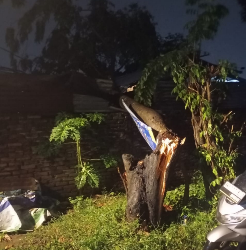 Kencangnya terjangan angin mengakibatkan pohon tersebut tumbang dan menimpa rumah salah seorang warga bernama Rosdiana.