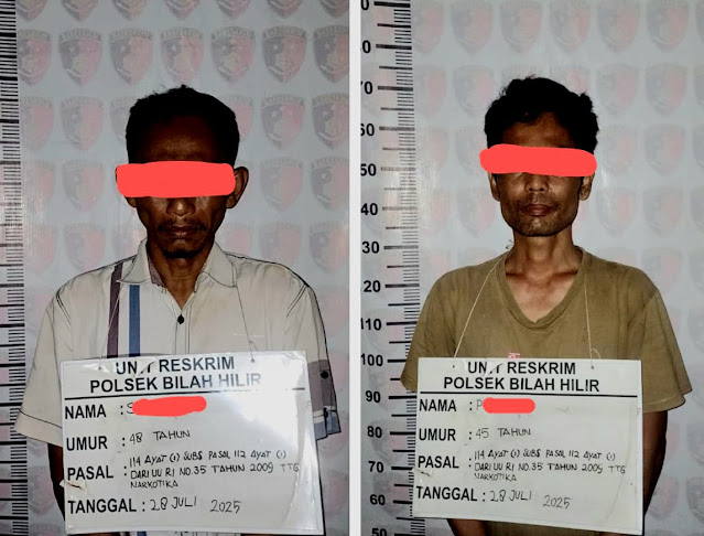 Tim Unit Reskrim Polsek Bilah Hilir Resor Labuhanbatu amankan dua orang pria terduga pelaku penyalahgunaan narkotika diwilayah Kecamatan Pangkatan, Kabupaten Labuhanbatu, Sumut. Kedua pelaku berhasil diamankan petugas pada, Minggu 27 Juli 2025 di Dusun II, Desa Sidorukun, Pangkatan.