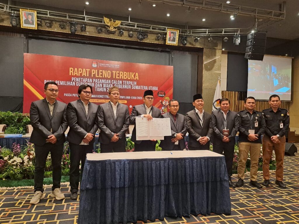 Komisi Pemilihan Umum (KPU) Provinsi Sumatera Utara (Sumut) menggelar Rapat Pleno Terbuka Penetapan Pasangan Calon (Paslon) Terpilih Pilgubsu 2024 dan Wakil Gubernur Sumatera Utara Tahun 2024, di Hotel Grand Mercure Medan, Rabu (5/2/2025).Rapat pleno terbuka penetapan Paslon Terpilih Pilgubsu 2024 dan Wakil Gubernur Sumatera Utara Tahun 2024, dilakukan pasca keputusan MK no 247/PHPU.GUB-XXIII/2025.